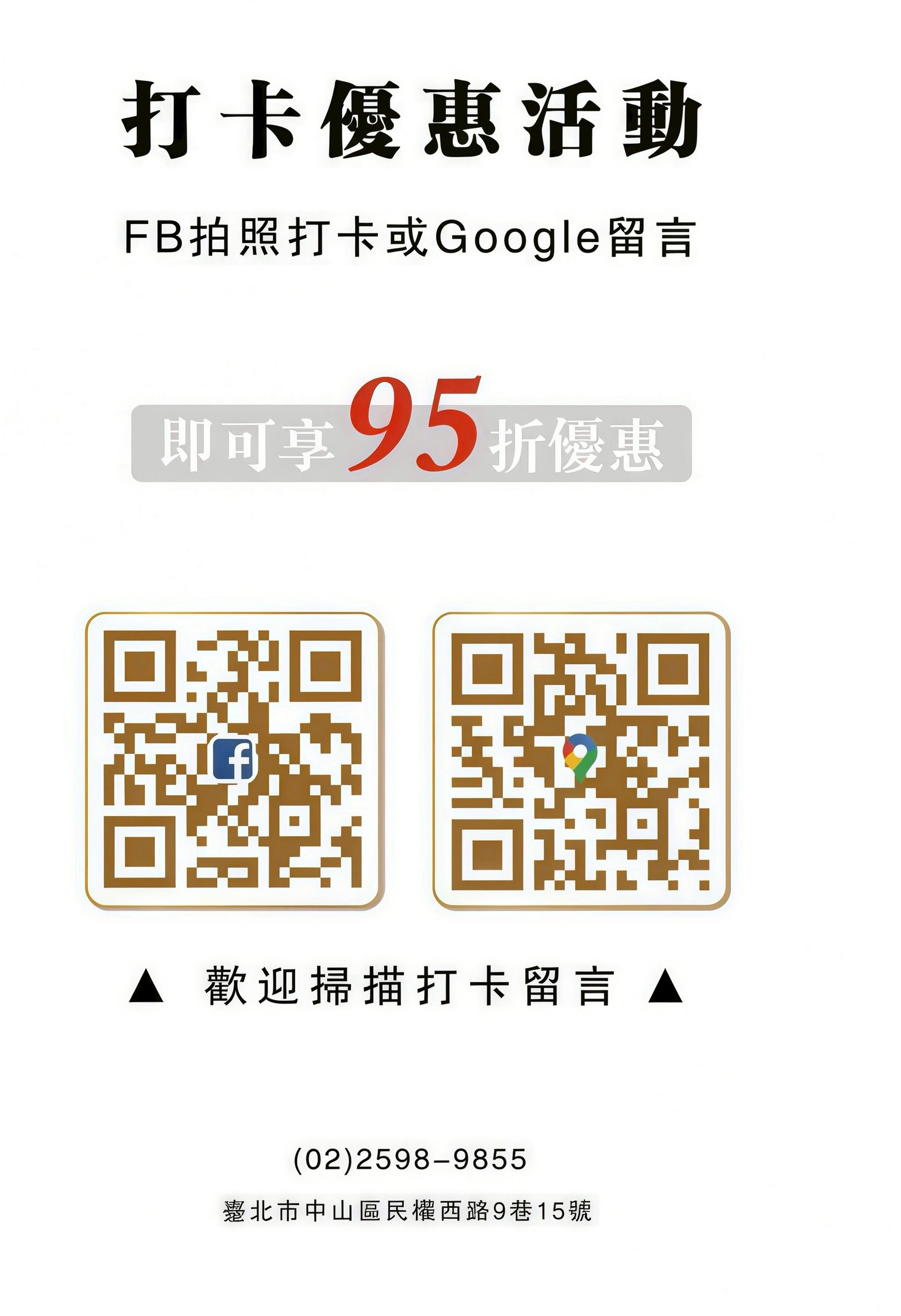 最新優惠 NEWS 會員儲值優惠方案 會員儲值優惠 VIP 儲值10,000元,享原價9折優惠 SVIP 儲值30,000元,享原價8.5折優惠 超值加碼 1.所有優惠套餐,會員均可折抵2.儲值金不限本人使用,無有效期 生日優惠 生日優惠 壽星當月消費 9 折同行好友 95 折不限消費次數 打卡優惠 打卡優惠 FB拍照打卡或Google留言即可享 95 折優惠歡迎掃描打卡留言